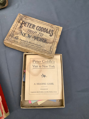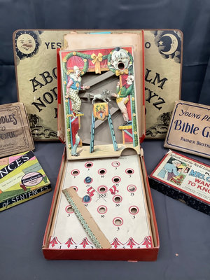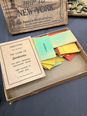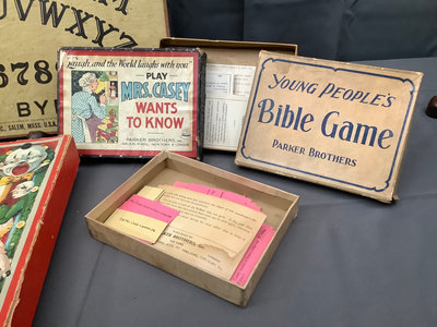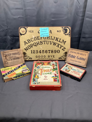 Features The Original Game of Sentences, Spears Comical Tivoli Game. Parker Brothers - Young People Bible Games, Peters Coddle's A Trip to New York, and Mrs. Casey Want to Know. Condition of the boxes vary, unknown completeness. Also a lone Ouija board. 6 pieces.