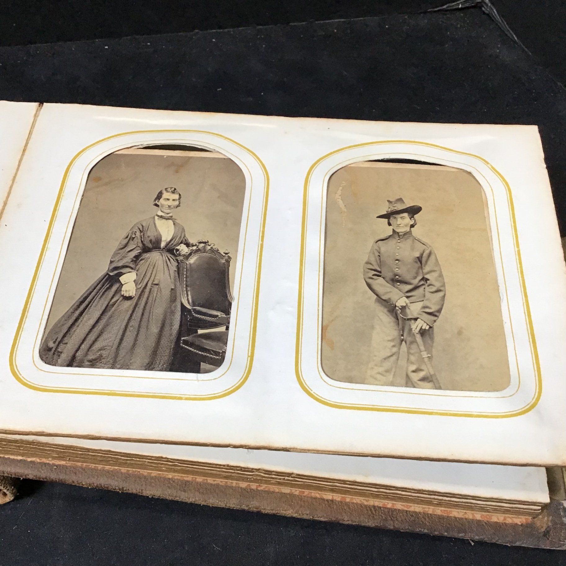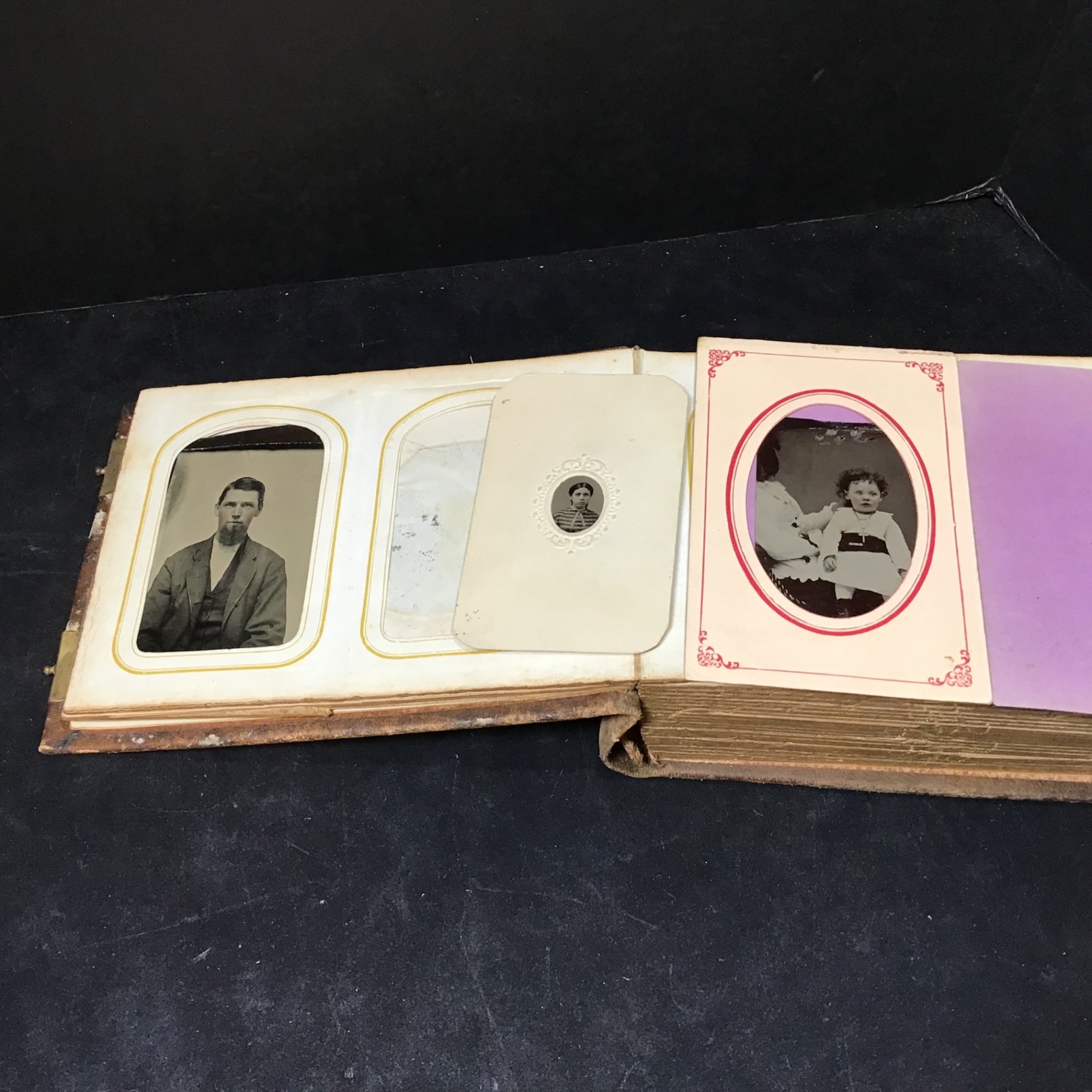 Antique photo albums, photo post cards, tintypes including a cute colored tintype of a dog on a table. Book with maps "The Hudson By Daylight" by Wallace Bruce, Bryant Literary Union, New York, 1898. 5 plus pieces.