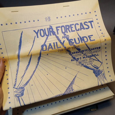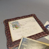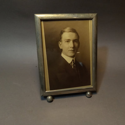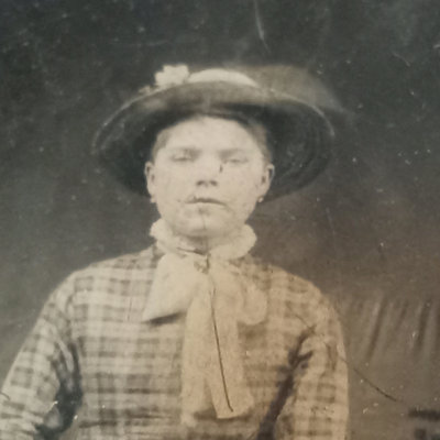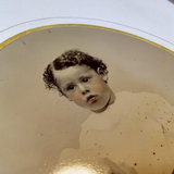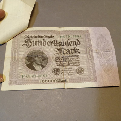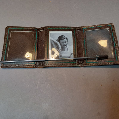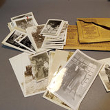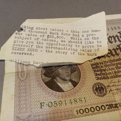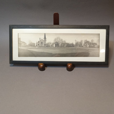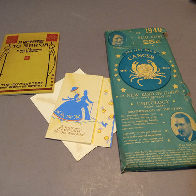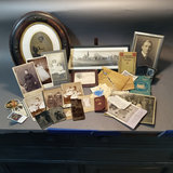 Large tintype in oval frame, hand colored cheeks, 14.25x12.25. Black & white panoramic of anytown MA, 5.75x14.5. Photo cards, small tintypes, Shakespeare mini book, black & white photos from the 1920s/1930s, 1940 Horoscope for Cancer, a 100,000 mark Reichsbanknote that was used as a marketing tool, and more. 25 plus pieces.