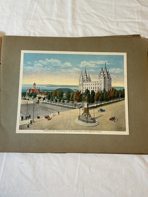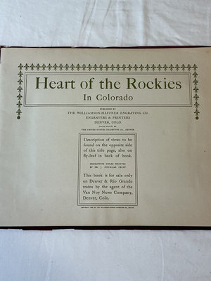 A collection of vintage railroad travel books featuring illustrated routes and western landscapes (Utah, Colorado, and the Rio Grande route), including titles such as From Salt Lake City to San Francisco Bay; Heart of the Rockies; Rocky Mountain Views; Crest and Chasm of the Continent; The Overland Route; The Trail of the Iron Horse; and other bound pages with scenic photographs. These books were published in the early 1900’s.