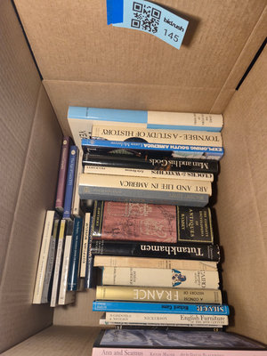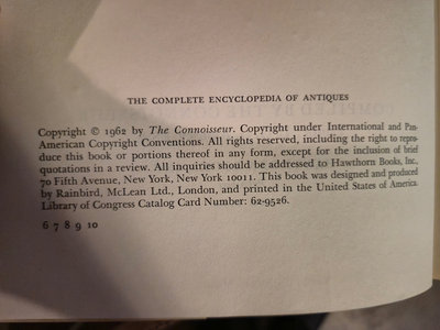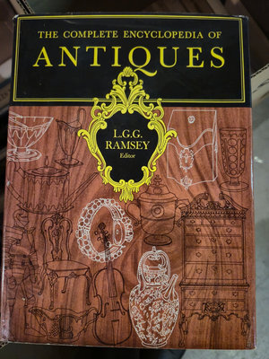 A collection of antique reference books and catalogs, including The Complete Encyclopedia of Antiques, covering furniture and decorative arts.