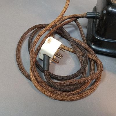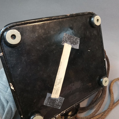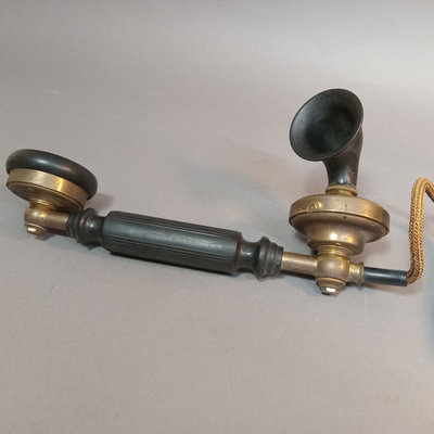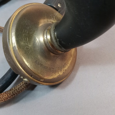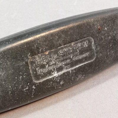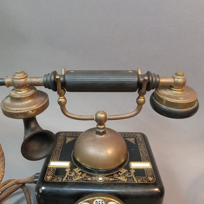 KTAS / Kjobenhavns Telefon-Aktieselskab heavy black enameled metal and brass phone, circa early 1900s, brass on handset, rest, and dial, gold leaf design on top, made in Denmark, weighs 5-8lbs, 10.5x6x8. Bell System Western Electric Company D1 black metal and bakelite rotary phone, made in USA, wire added to make it useable with today's landline wiring, 9x5x6. Chipping paint on metal, scuffs, scratches, and grime consistent with age and use. 2 pieces.