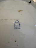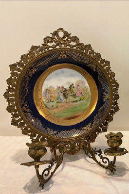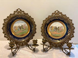 Austrian cobalt blue hand painted porcelain 9” plate with pastoral setting scene and ornate gilded brass frame . Has rococo theme style and design . The frame features two candle holders at the bottom .