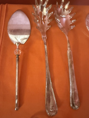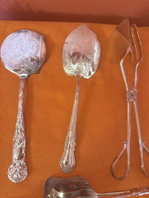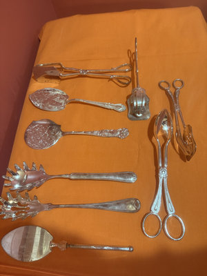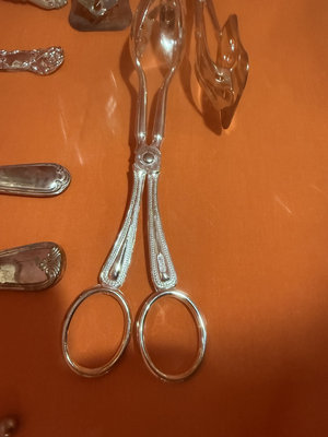 An assortment of ornate silver-plated dining utensils including serving spoons and forks, carving and salad serving implements, tongs, scissors,