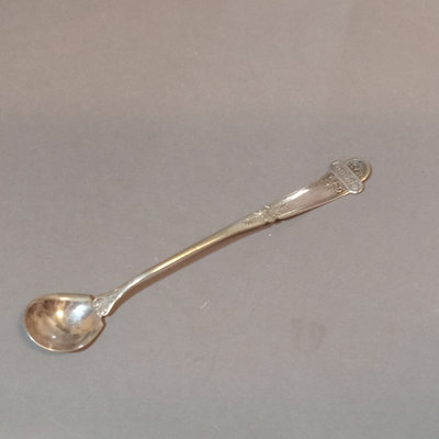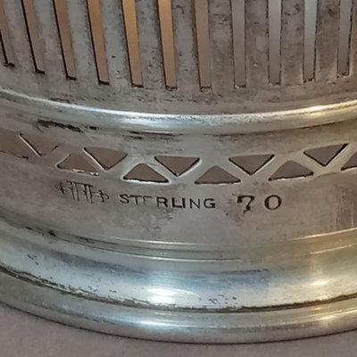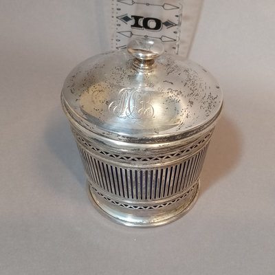 Sterling silver No. 70 reticulated holder and lid, unknown makers mark, 56.0dwt, with cobalt blue glass jar and Rogers A1 spoon. 2 pieces.