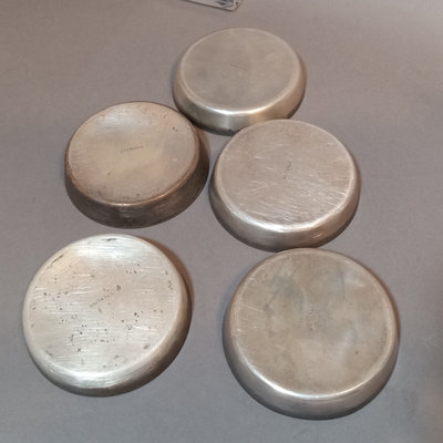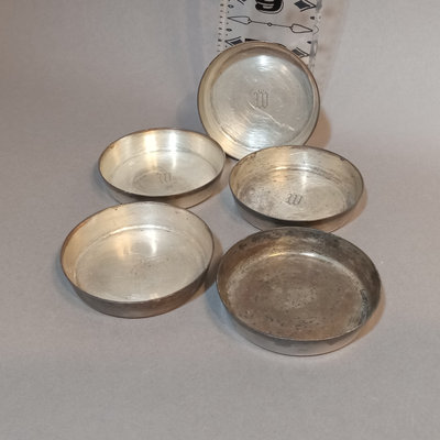 Antique sterling silver coasters with W monogram in center, 2.75d, 130.5dwt overall. 5 pieces.