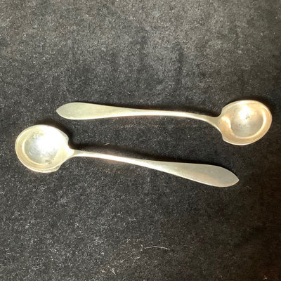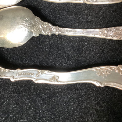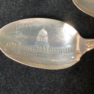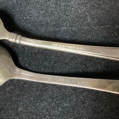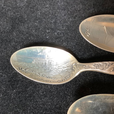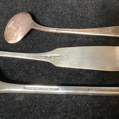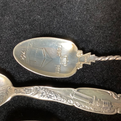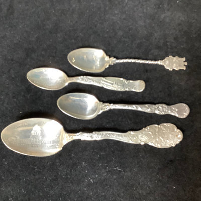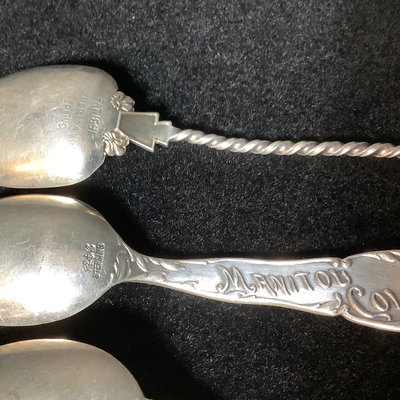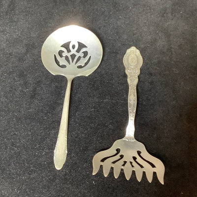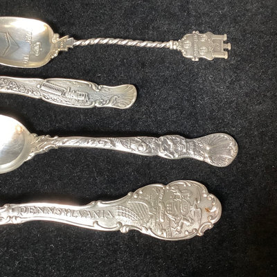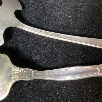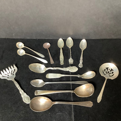 Antique sterling and nickel silver tableware, includes sardine fork, Lunt tomato spoon, pair of S.A. MacQueen Co. sugar spoons, several J.E. Caldwell & Co. spoons, Tiffany & Co. spoon, and several collector spoons. Overall 142.8 dwt. 13 pieces.