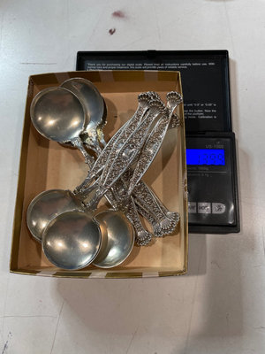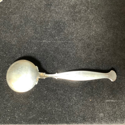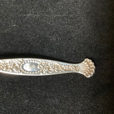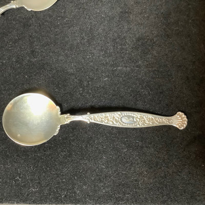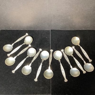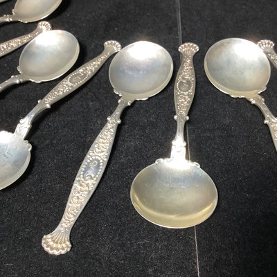 Set of antique sterling soup spoons, W Lion stamp, possible Wendell Manufacturing Co., with J monogram on handle. Overall 139.9 dwt. 12 pieces.