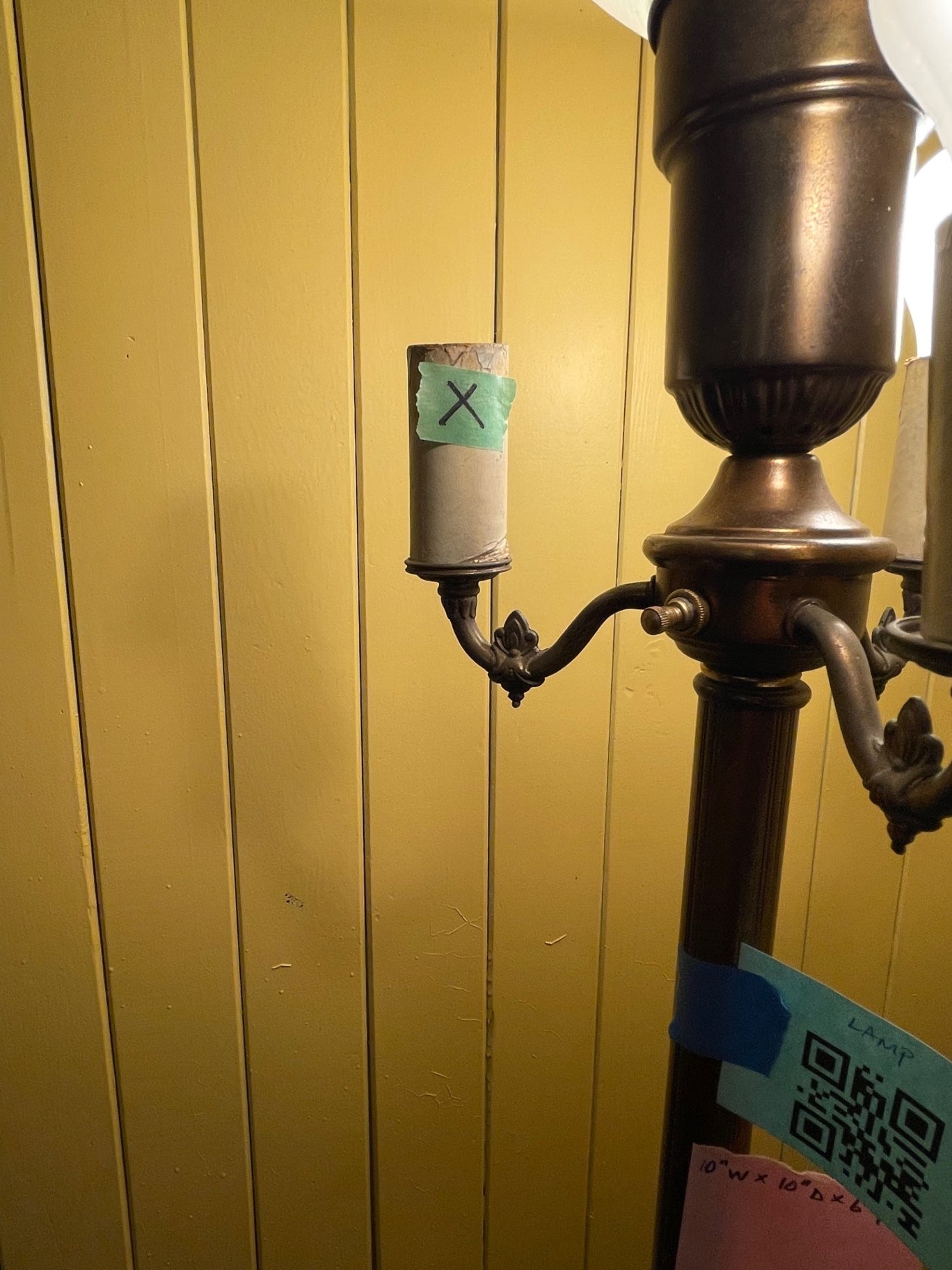 Vintage floor lamp with a dark metal column, carved details, a white marble/onyx base, and milk glass shade. Surrounded by 3 light arms (note 1 not working). 10x10x62"