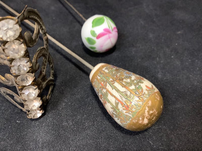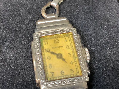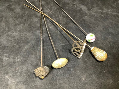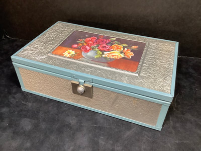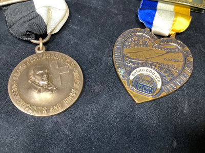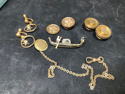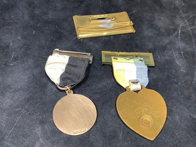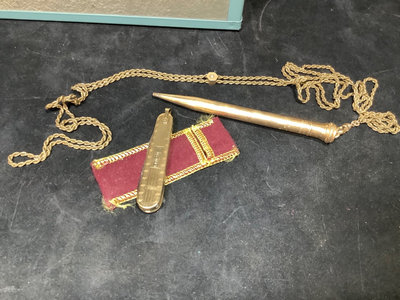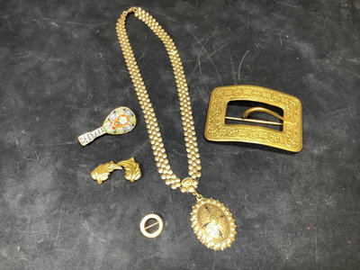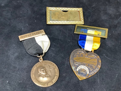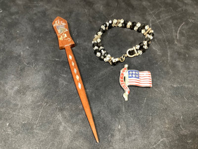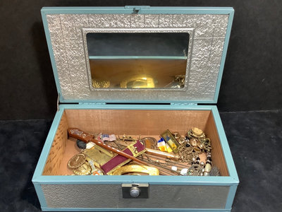 Metal and wood jewelry box, no key, 10.25x6.25x3. Hat pins, monogrammed picket knife, WAHL gold filled mechanical pencil on long chain, necklaces, earrings, bracelet, brooches, medals, micro mosaic brooch made in Italy, and more. Some items broken or have condition issues. 25 plus pieces.