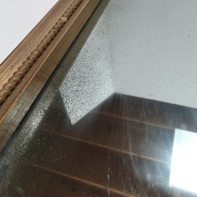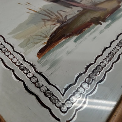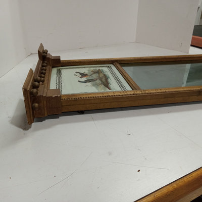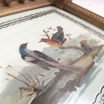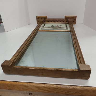 Antique mirror, top panel with reverse painted bird scene, lower section with mirror, starting to de-silver in places, echoes of gilt gold painting on frame. Solid construction despite its age. 18.25x4.5x33. 1 piece