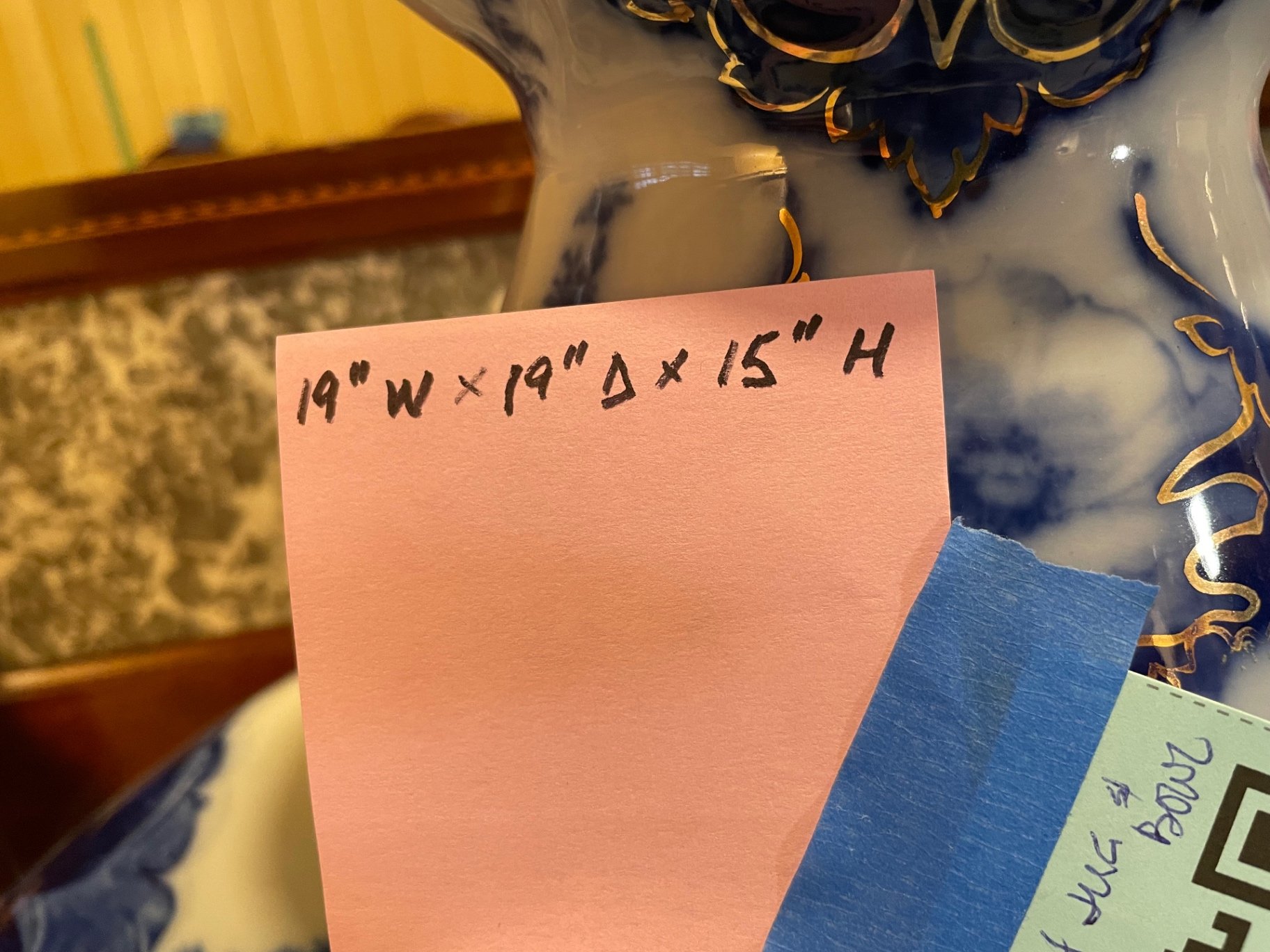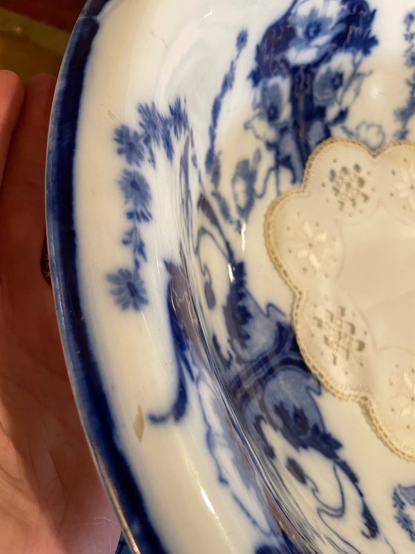 Antique wash stand pitcher & bowl. Maker: Woods. Pattern: Glenwood. Stamp on back: Glenwood, Royal Semi Porcelain Wood & Sons England. A cobalt-blue and white porcelain pitcher & bowl with gilded rim & gilt highlights to floral patter. Matching bowl, both decorated with floral and scroll motifs on a white ground.