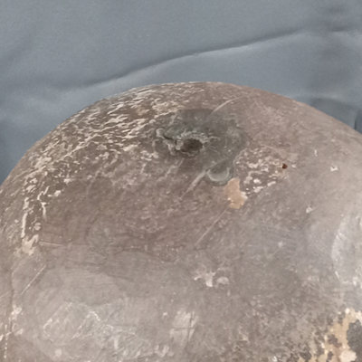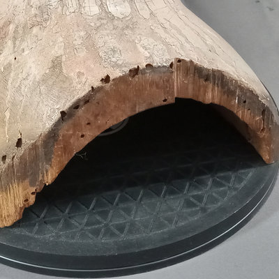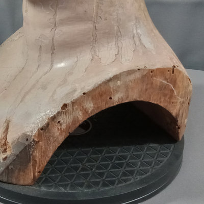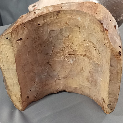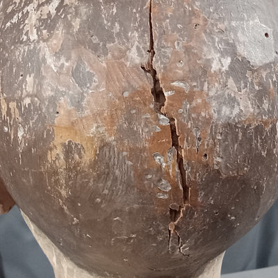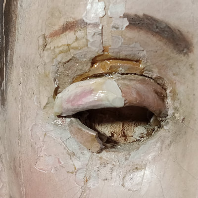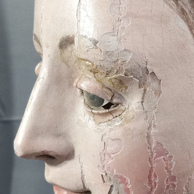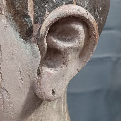 Antique carved wooden head or mannequin bust, hand painted with chipped brown glass eye. Holes along edges where clothing or other fixtures would have been attached. One eye is missing, chipping of paint to expose the layers. 6.5x7x13. 1 piece.