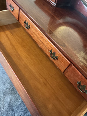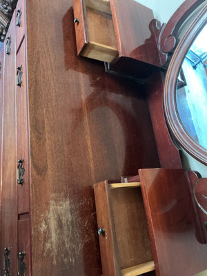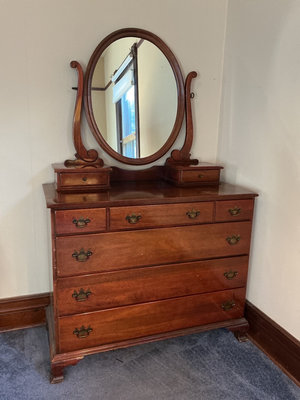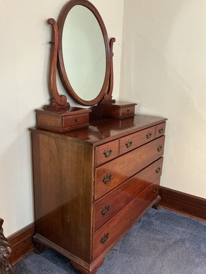 A vintage dark wood dresser featuring an oval attached mirror, two small pedestal drawers on each side, and multiple larger drawers with brass hardware. The interior of a bottom drawer contains built-in dividers, and a label from Hickory Furniture Manufacturing Company is affixed to the inside panel. Dimensions are 45 inches wide by 20 inches deep and 71 inches tall. Some signs of wear throughout