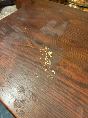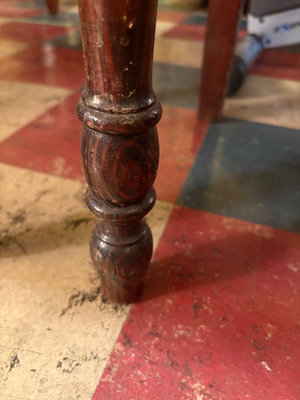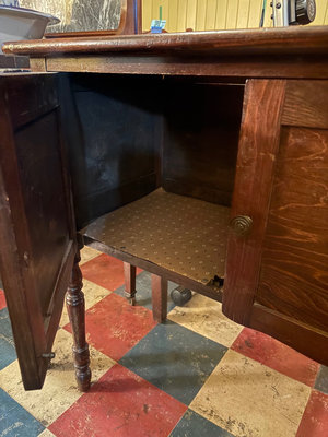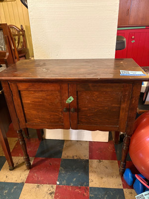 A vintage dark-stained wooden cabinet with two front panel doors, turned legs, and brass knobs. Great storage for small spaces. The surface shows scratches wear. Dimensions: 32”x15.5”x30.75” **BRING HELP TO MOVE OUT OF BASEMENT.