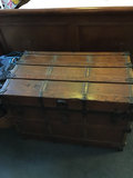 A vintage wooden trunk with metal hinges, bands and corner fittings; the interior is lined with green patterned fabric Approx 28x14x14
