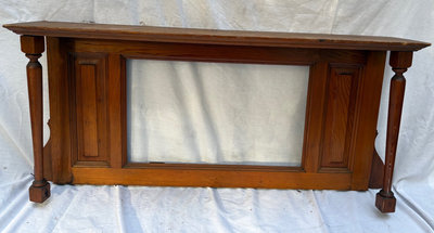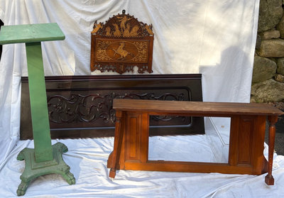 Wall Hanging : Victorian era music leaf turner , now a pretty wall hanging . Piano front panel : 54.5” long, x 18” Mantel 37” x 7” deep Plant stand : 35.5” tall, 12” square top