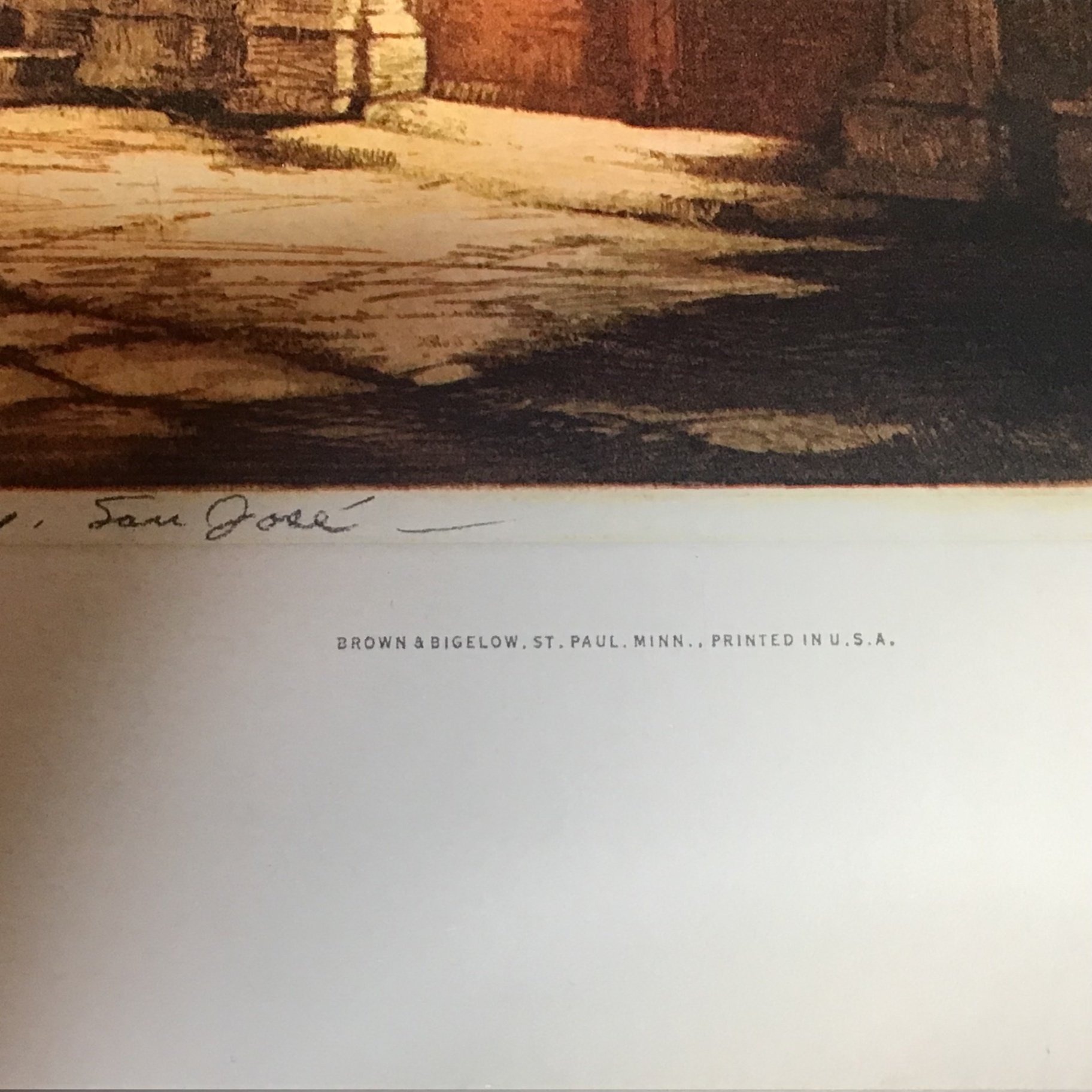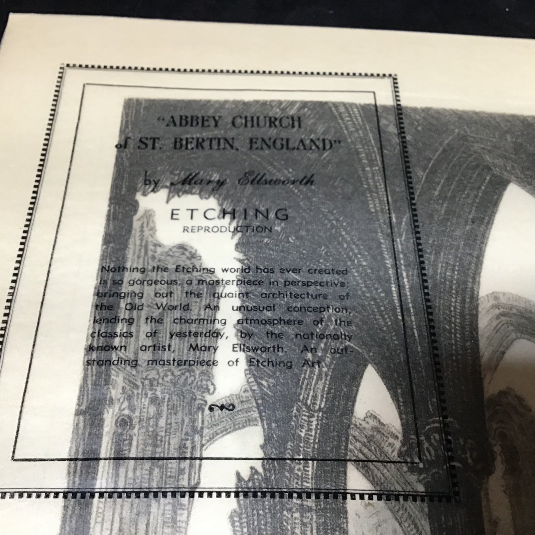 Art Reproductions for 1940 by Joseph Hoover & Sons Company, booklet. Masters of Photography 1844-1954, Scott Elliot Gallery, folio. Unframed print Maxfield Parrish "Christmas Morning." Unframed etching Al Mittel "Old Doorway, San Jose." Unframed etching Mary Ellsworth "Abbey Church of St. Bertin, England." Largest unframed is 17x14.5. 5 pieces.
