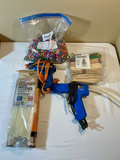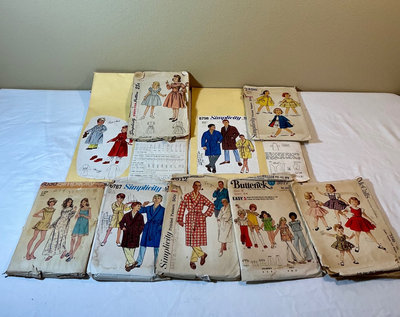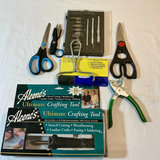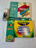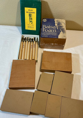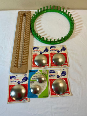 A mixed collection of arts and crafts items including painting supplies (paints, brushes, markers, colored pencils), glue sticks, scissors, beads, buttons, a hot glue gun, a weaving loom, wood carving and woodworking tools, balsa foam, wooden blocks, pattern-making materials, and vintage sewing patterns.