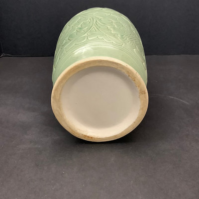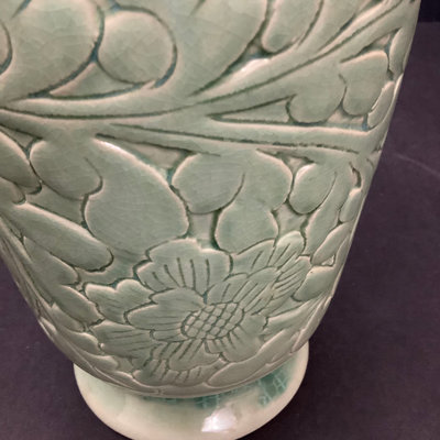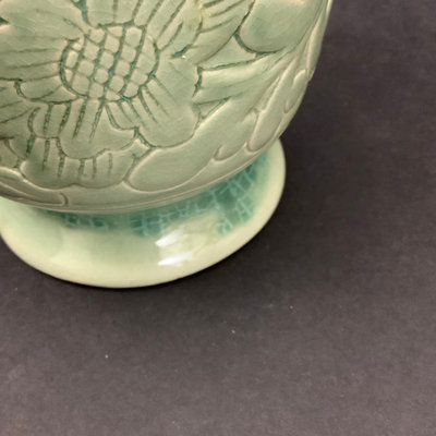 Vintage Asian celadon green flower vase with raised floral and leaf pattern, 5.5dx10.5h. 1 piece.