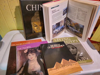 A collection of art, history, and photography books including titles such as Rembrandt, Renoir, The Visual Experience, The Riddle of the Pyramids, Living Egypt, China, and Sports Cars.