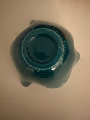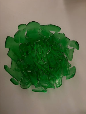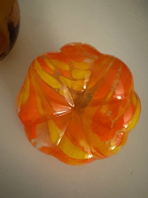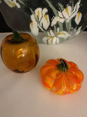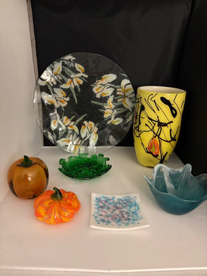 A collectible Sydenstricker shows a fused art glass plate featuring a white iris floral design. The artist, Bill Sydenstricker, was a glass maker based on Cape Cod, MA operating his studio from the 1960s until his passing in 1994. The pieces are handmade, and feature a distinctive ruffled or ripple edge. A bright and funky hand blown glass vase, 10” tall, 5.5” diameter, A figural swirl hand blown pumpkin, a bright green layered dish of recycled glass, a textured trinket dish of speckled glass in blue and pink and purple and a handmade swirled blue bowl.