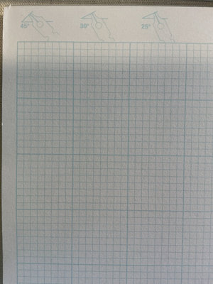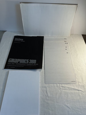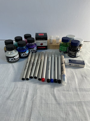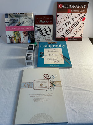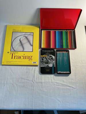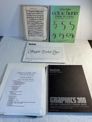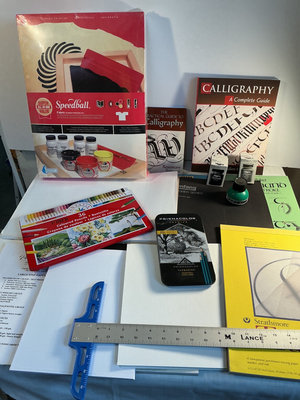 A collection of art materials including tracing paper and drawing papers, graph paper pads, a rainbow set of colored pencils, a smaller tin of turquoise pencils, a screen printing kit with inks, and multiple calligraphy guides, practice papers, and related stationery.