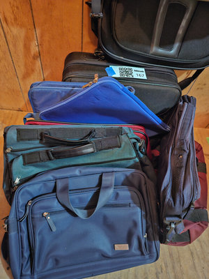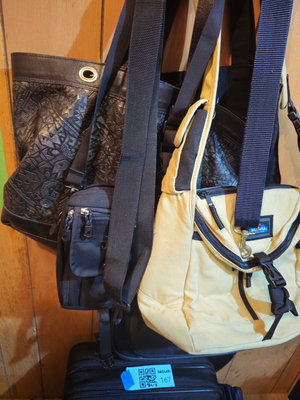 A collection of assorted bags and backpacks in blue, beige, and black, including a blue travel bag with multiple compartments, a beige shoulder bag, and a black embossed backpack with several zip pockets and straps. ** BRING OWN PACKING MATERIALS
