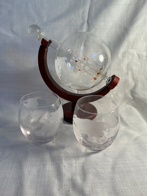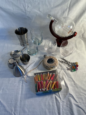A mixed collection of entertaining items including two clear tumblers, two frosted globe glasses with map motifs, and matching glass decanter globe on a curved wooden stand, stainless steel bar tools (jigger, funnel, strainer, and a ladle), a rope-wrapped small metal flask, paper umbrellas and decorative cocktail picks with colored ends.