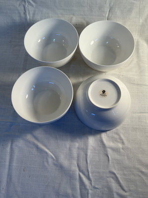 Eight bowls total: four white ceramic bowls, two large clear glass bowls, one blue bowl, and one red bowl.