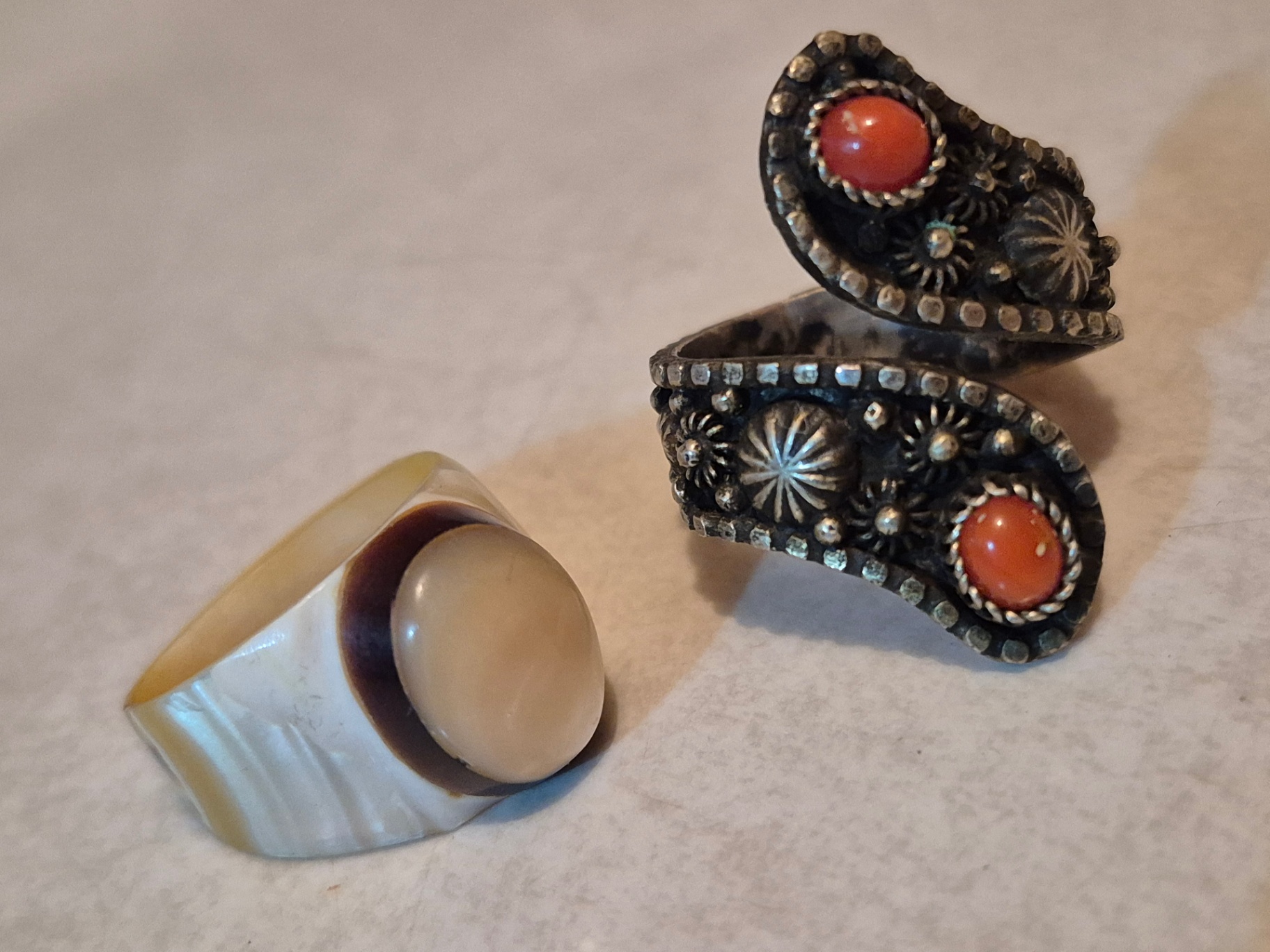 A collection of jewelry pieces including multiple bangles and bracelets with turquoise accents and red/orange cabochons, drop earrings with shell-like elements, and various rings. Box included. ** BRING OWN PACKING MATERIALS