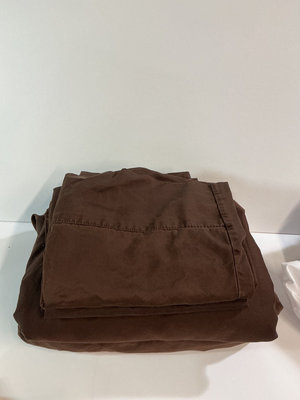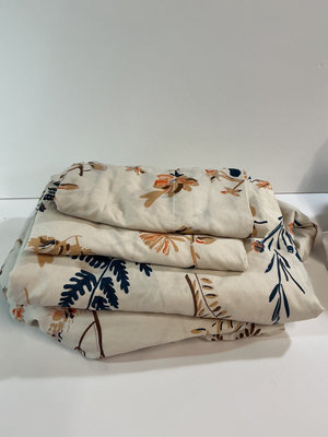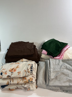 A collection of CAL KIng bed linens, includes brown solid sheets, cream and grey sheet polka dot, and beige floral print bedding with orange and blue accents. There is also a Terry cloth mattress pad, a cream colored bed skirt and three satin pillowcases.