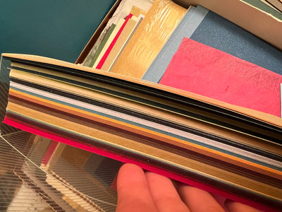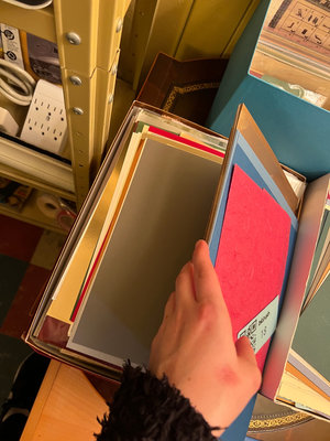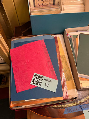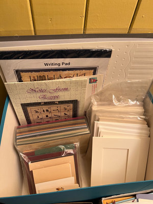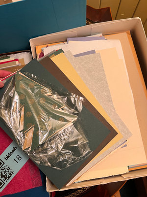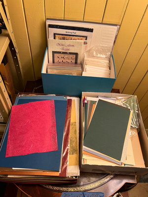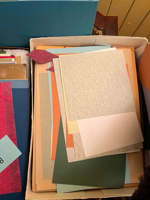 Boxes of assorted scrapbook papers, colored cardstock, and blank notecards. **BRING OWN PACKING MATERIALS