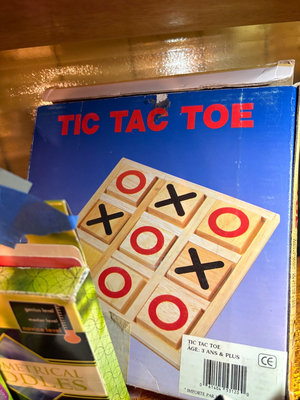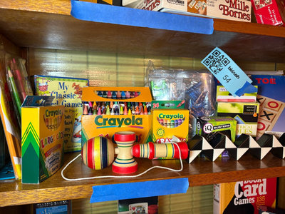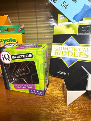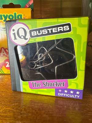 A collection of vintage children's items including Crayola crayon boxes and supplies, a tic-tac-toe game, a wire puzzle 'The Shocker' by IQ Busters, geometrical riddles, and a Q-ball-maze set. **BRING OWN PACKING MATERIALS, NOT TESTED FOR COMPLETENESS.