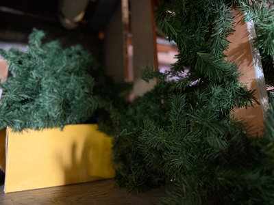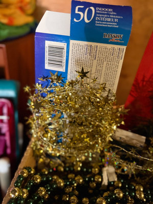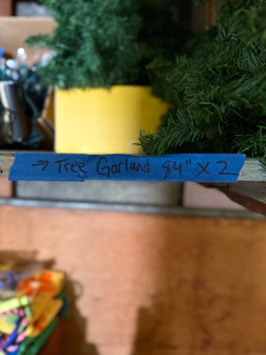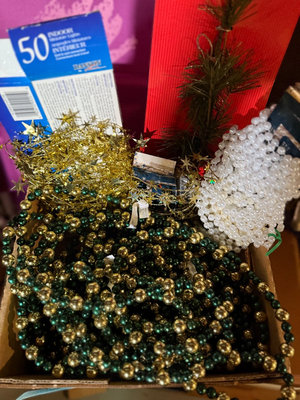 An assortment of decorative bead garlands in gold, green, and white, gold star accents, a small artificial evergreen tree, and a blue-labeled tag reading 'Tree Garland' among other holiday decorations. ** BRING OWN PACKING MATERIALS