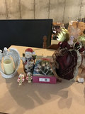 Assorted Christmas decor items including angel and Santa figurines, an angel flameless candle, snowman candle holder, stocking hooks with JOY lettering, a decorative fabric centerpiece, and a box of holiday lights.