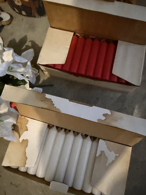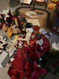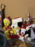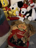 An assorted group of Christmas holiday items including plush characters (Snoopy, Santa, reindeer, Tweety), decorative wooden signs, a snowman-themed mat, a holiday-themed vase with blue stems, poinsettia arrangements, and boxes of red and white candles.