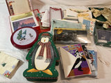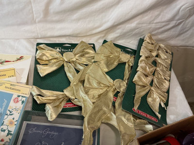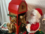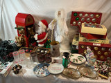A collection of Christmas decor items including a red display house with a reindeer figure, Santa Claus figure, various glass ornaments in labeled boxes, holly-themed plates, gold-toned trays, ribbons and bows, string lights, small festive figurines, and assorted seasonal cards and trinkets. Lights and animated Santa with reindeer have been tested.