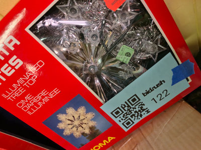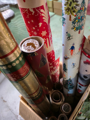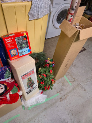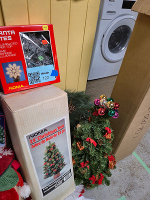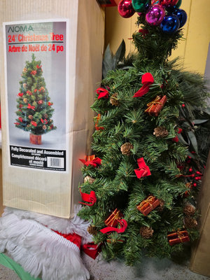 A collection of holiday decor items including a boxed 24-inch Christmas tree, an illuminated tree top, a small decorated artificial Christmas tree with red bows and pinecones, and several rolls of Christmas gift wrap, along with additional seasonal decor items. **BRING OWN PACKING MATERIALS