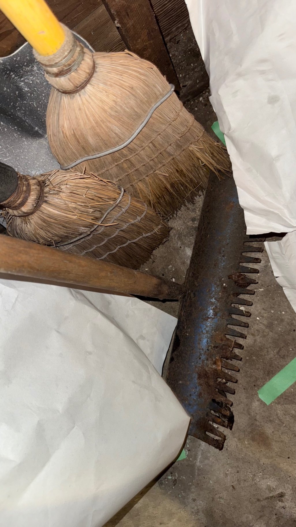 An assortment of cleaning and gardening tools including straw brooms, a wooden-handled broom, a shovel, a rake with a toothed head, and various long handles. As is as found. **BRING OWN PACKING MATERIALS