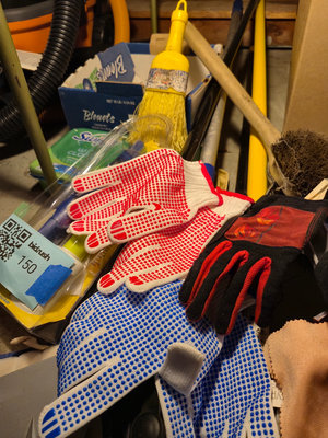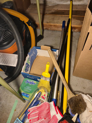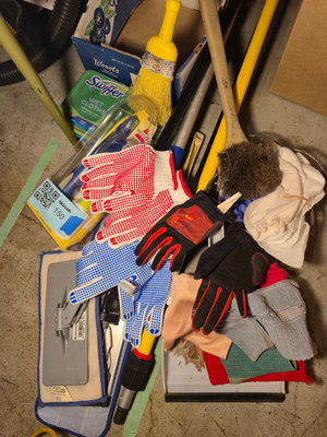 A collection of cleaning tools and protective gloves, including a broom, brushes, sponges, rags, and a box of wet cloths. ** BRING OWN PACKING MATERIALS