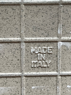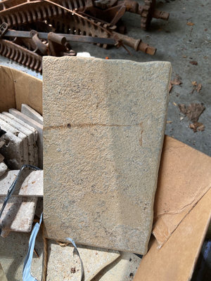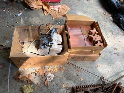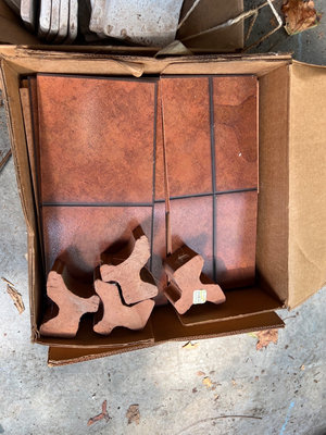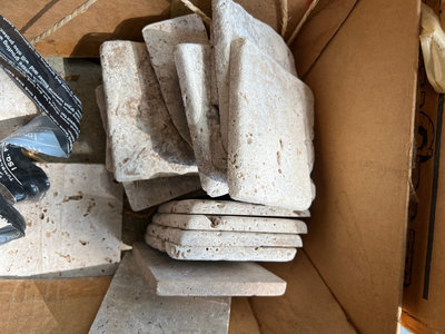 A collection of stone and vinyl materials including rough stone tiles made in Italy, and boxes labeled Vinyl Tile with loose tile pieces Located in garage.