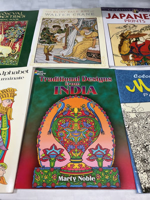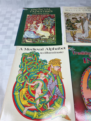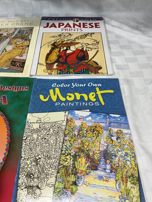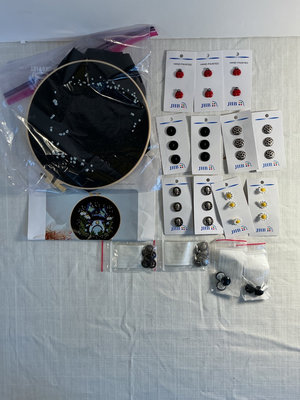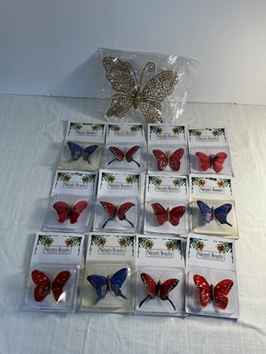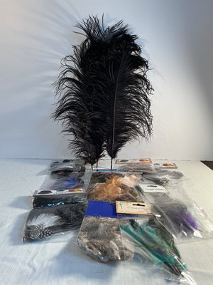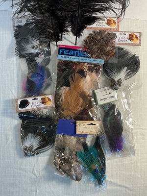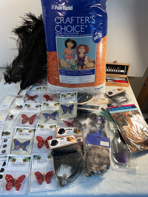 A collection of craft and costume accessories including large black feathers, assorted feather strands and hat decor, decorative butterflys, embroidery hoop with fabric, a set of hobby blades and handles, hair and jewelry findings (studs, buttons, charms), various feather embellishments and trims, and a bag of polyester stuffing for crafts. Six Adult coloring books.
