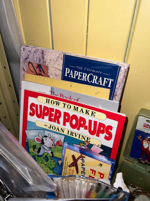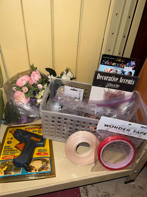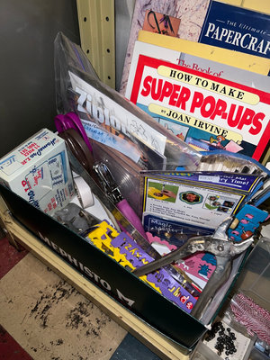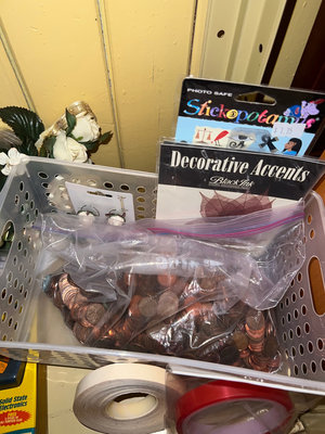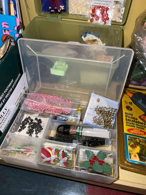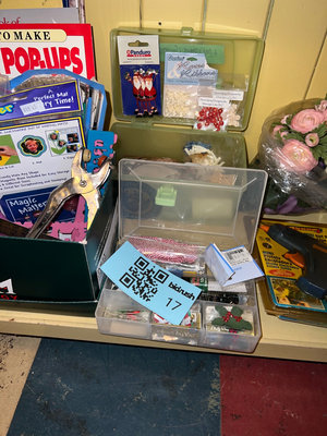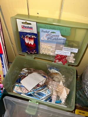 Assorted craft supplies including papercraft books, decorative accents, ribbons, beads, small embellishments, bag of pennies, and miscellaneous tools stored in plastic boxes and organizers. **BRING OWN PACKING MATERIALS & HELP TO MOVE OUT OF BASEMENT