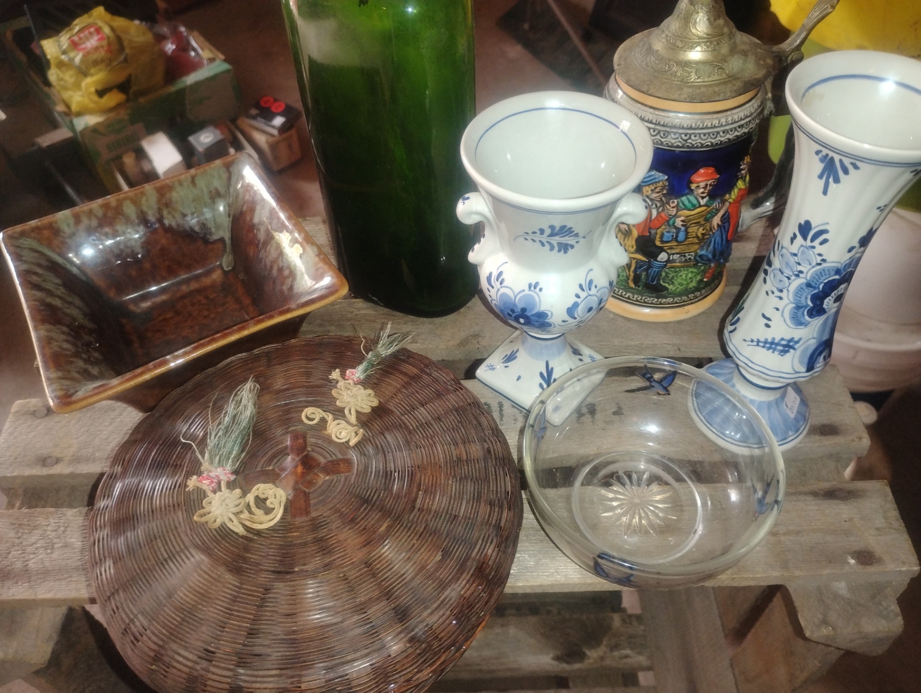 A collection of decorative items including blue-and-white ceramic vases, a tall blue-patterned vase, a lidded ceramic jar with a decorative metal lid, a round woven wicker basket lid with embroidered embellishments, a rectangular brown glazed dish, a clear glass bowl, and a green glass bottle.