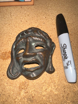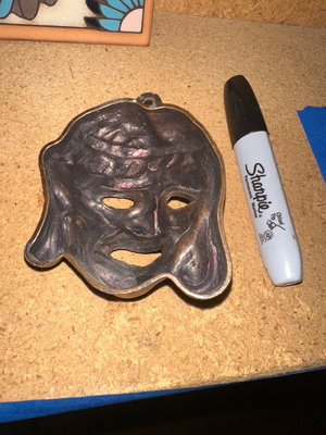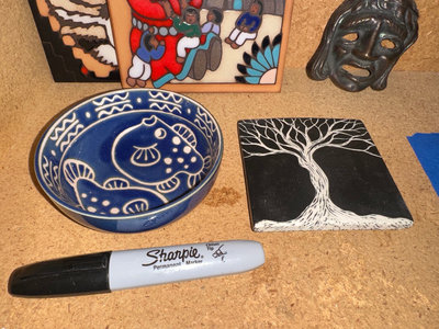 A collection of decorative ceramic tiles including a wolf/fox motif tile, a family scene tile, and a tree motif tile, a blue ceramic bowl, a metal theater mask.