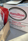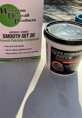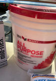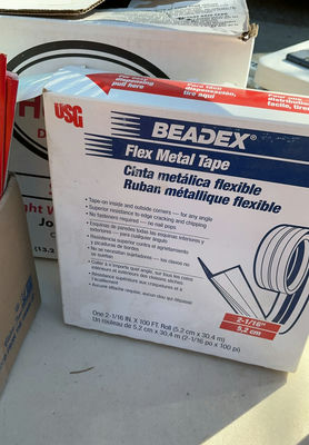 A mixed group of drywall-related tools and materials including a USG Beadex All Purpose Joint Compound bucket, USG Beadex Flex Metal Tape, Strait-Flex Mid-Flex 300 composite tape, Strait-Flex Fast Straight Easy tile tape, a can of Weldwood contact cement, a package of KleenGuard heavy duty coveralls, and various hand tools such as drywall saws, trowels, sanding tools, brushes, and utility items.