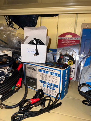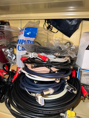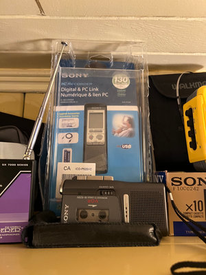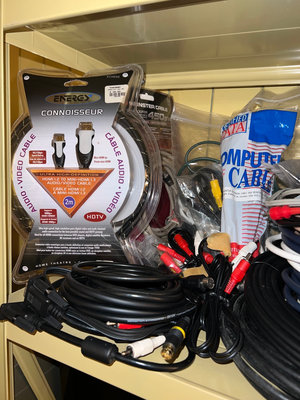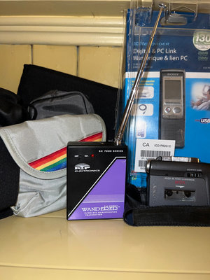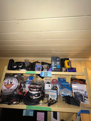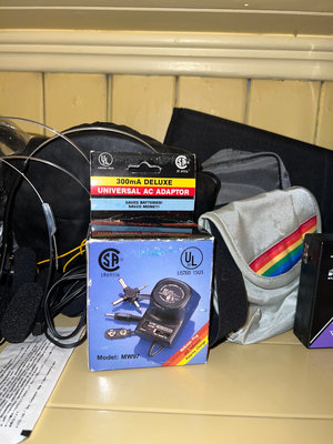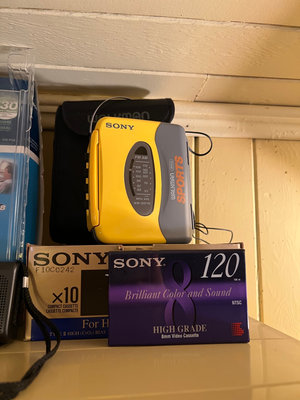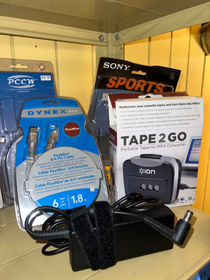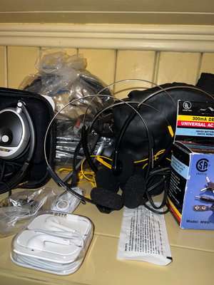 A collection of electronic devices and related accessories including headphones in a protective case, multiple audio cables and connectors, adapters, a battery tester, cassette tapes and players, Sony Walkman, a portable speaker, and various packaging and carrying cases. **BRING OWN PACKING MATERIALS AND HELP TO MOVE OUT OF BASEMENT