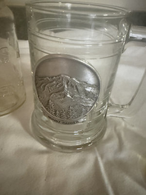 Clear glass drinking vessels including Jack Daniel's Lynchburg Lemonade glasses and mugs, a Westminster Country Club tumbler, and a Mount Rainier etched tumbler, along with other souvenir glassware bearing promotional logos.
