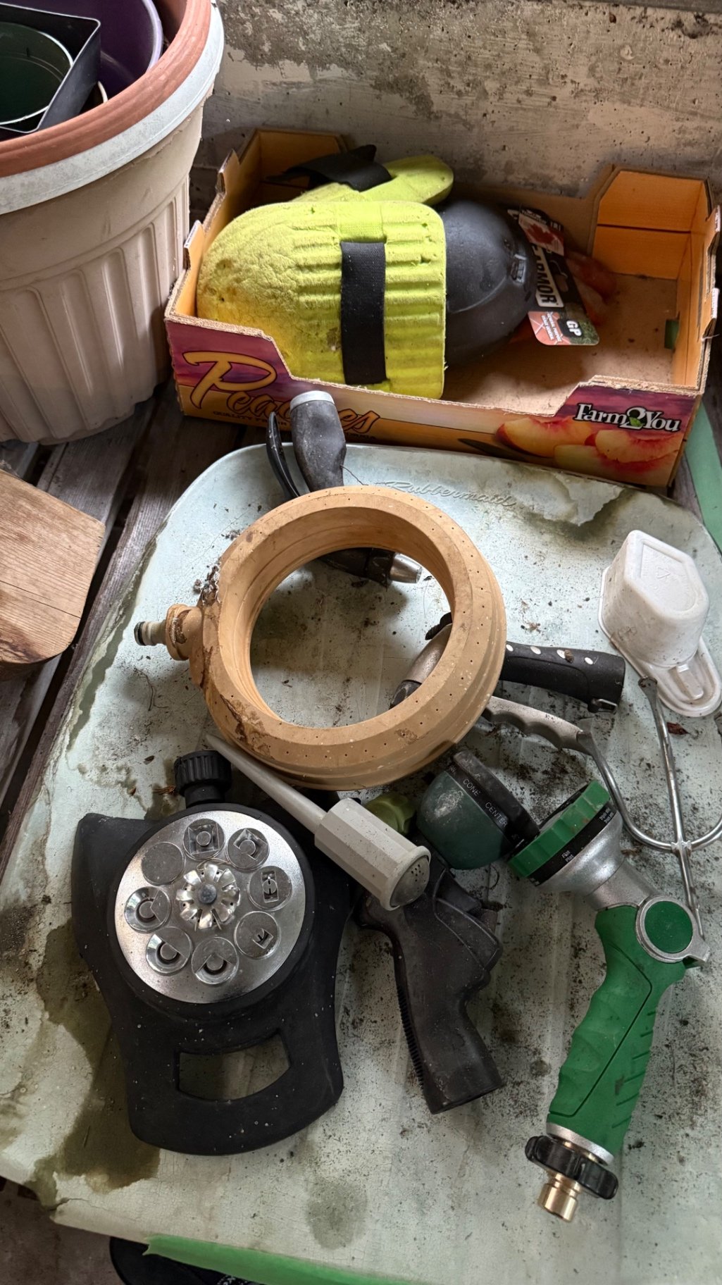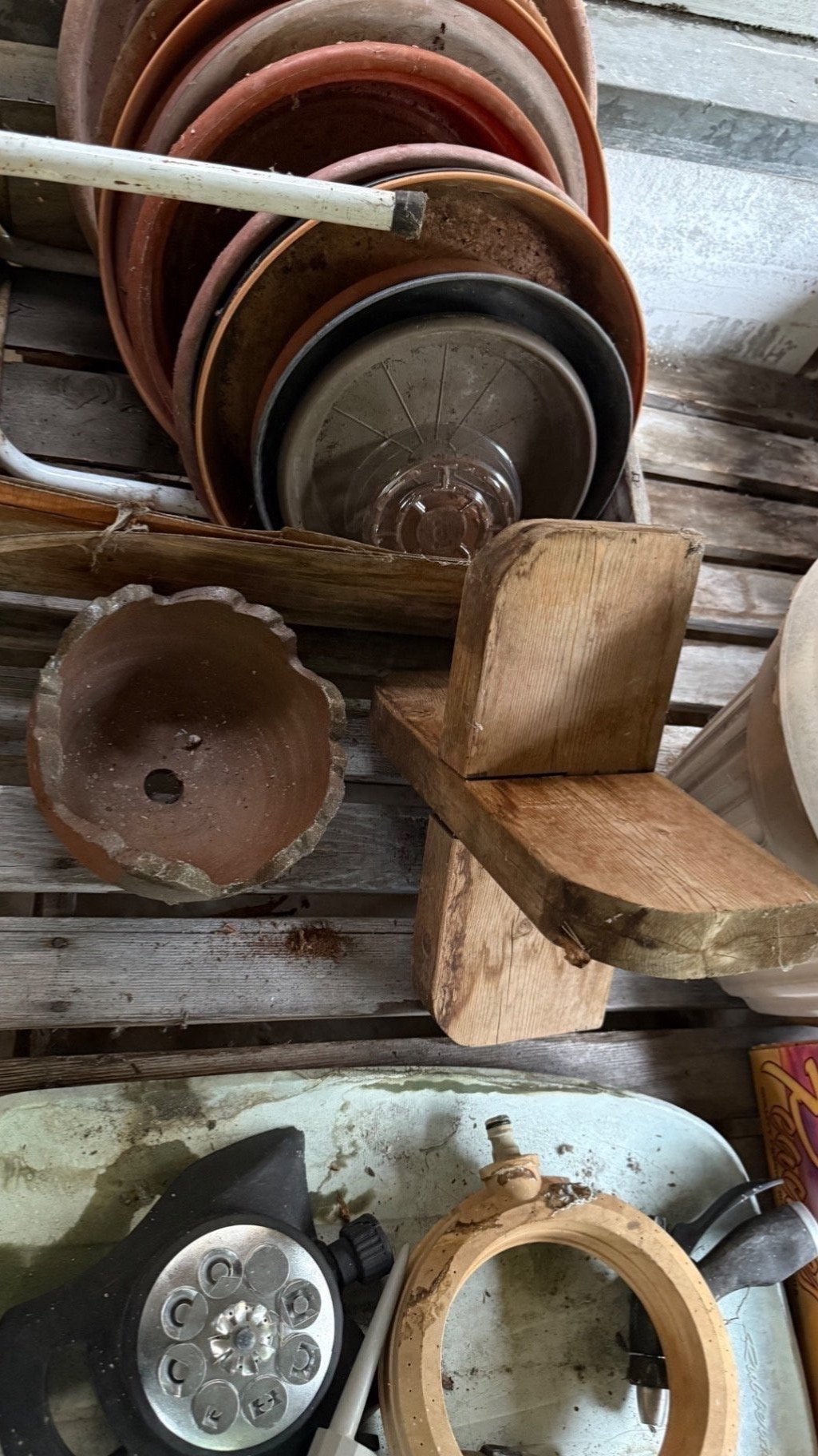 A collection of terracotta and plastic plant pots, nested and stacked, with a wooden stand/blocks and various gardening tools and accessories including a hose nozzle, rings, and a cardboard box containing gloves and related items. **BRING OWN PACKING MATERIALS